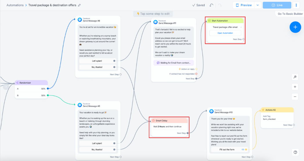 Diseña flujos de conversación complejos sin tocar una sola línea de código. Su interfaz visual te permite mapear embudos completos arrastrando y soltando elementos de forma rápida y sencilla.