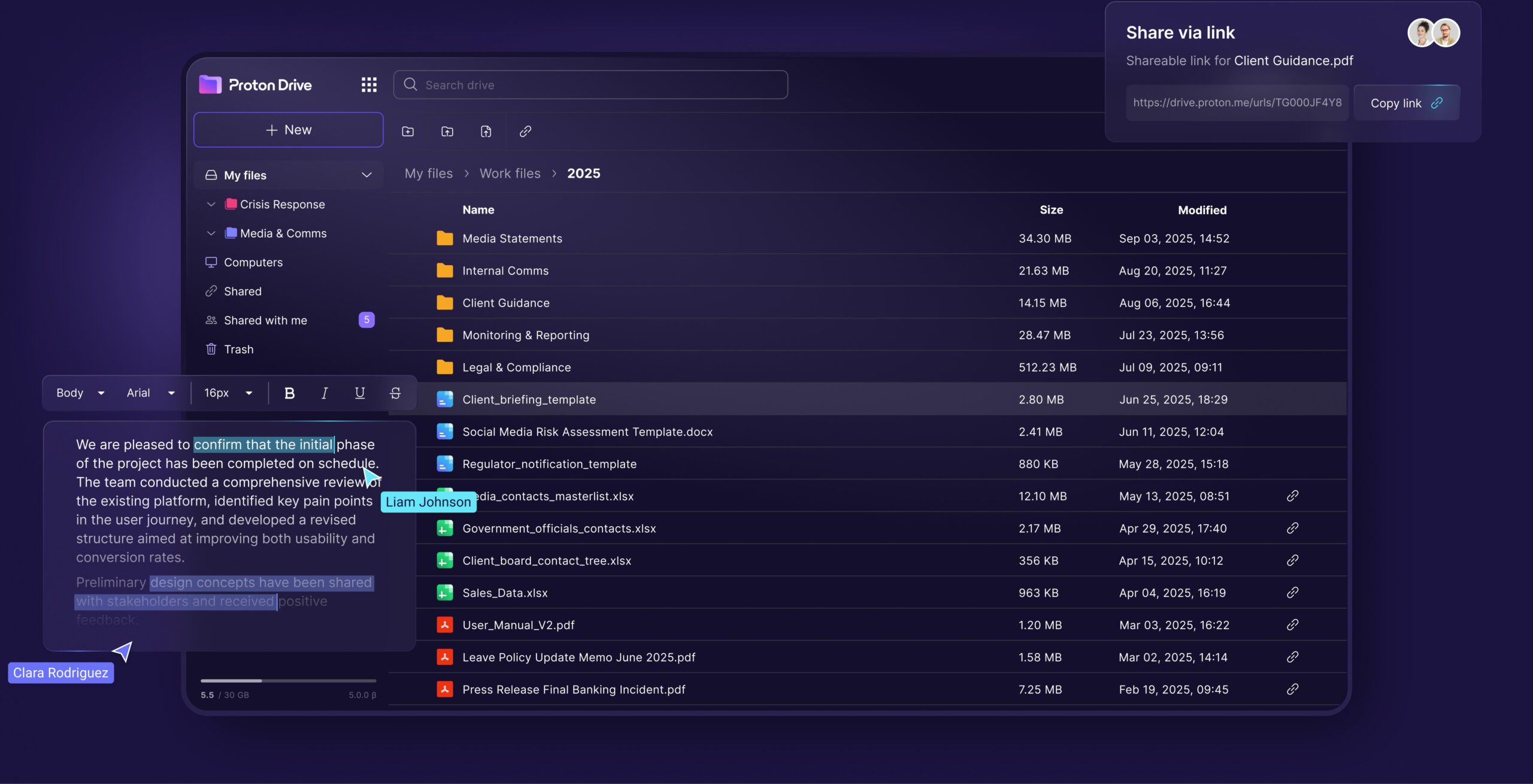 Guarda, sincroniza y comparte archivos sensibles de tu empresa a través de Proton Drive. Crea enlaces protegidos con contraseña o fecha de caducidad para colaborar de forma totalmente confidencial.