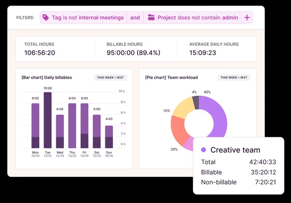 La plataforma convierte los datos de tiempo en informes detallados que ayudan a mejorar la productividad, gestionar proyectos con mayor eficacia y aumentar la rentabilidad.